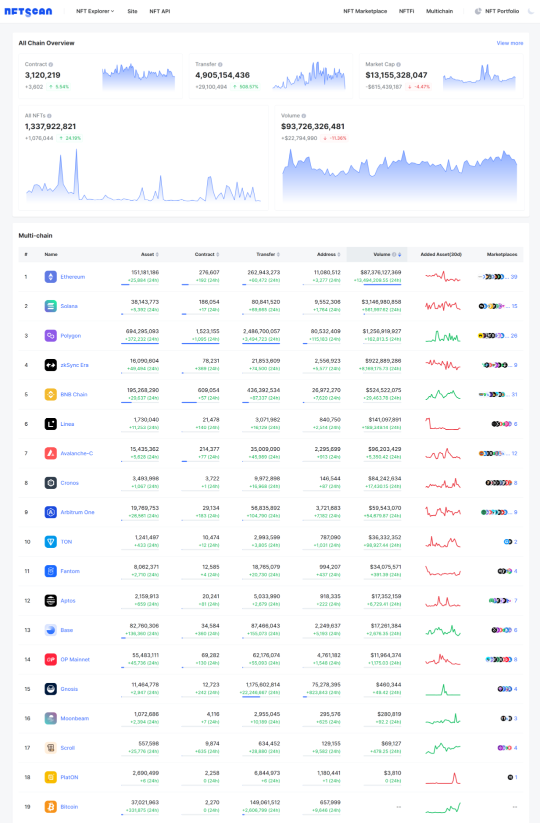 截至 2023 年 11 月 6 日,NFTScan 目前已支持 Bitcoin、Ethereum、BNBChain、Polygon、Solana、Avalanche、Arbitrum、Optimism、zkSync、Aptos、Linea、Base、TON、Scroll、Fantom、Moonbeam、PlatON、Cronos、Gnosis 19 条主流区块链网络共产生: