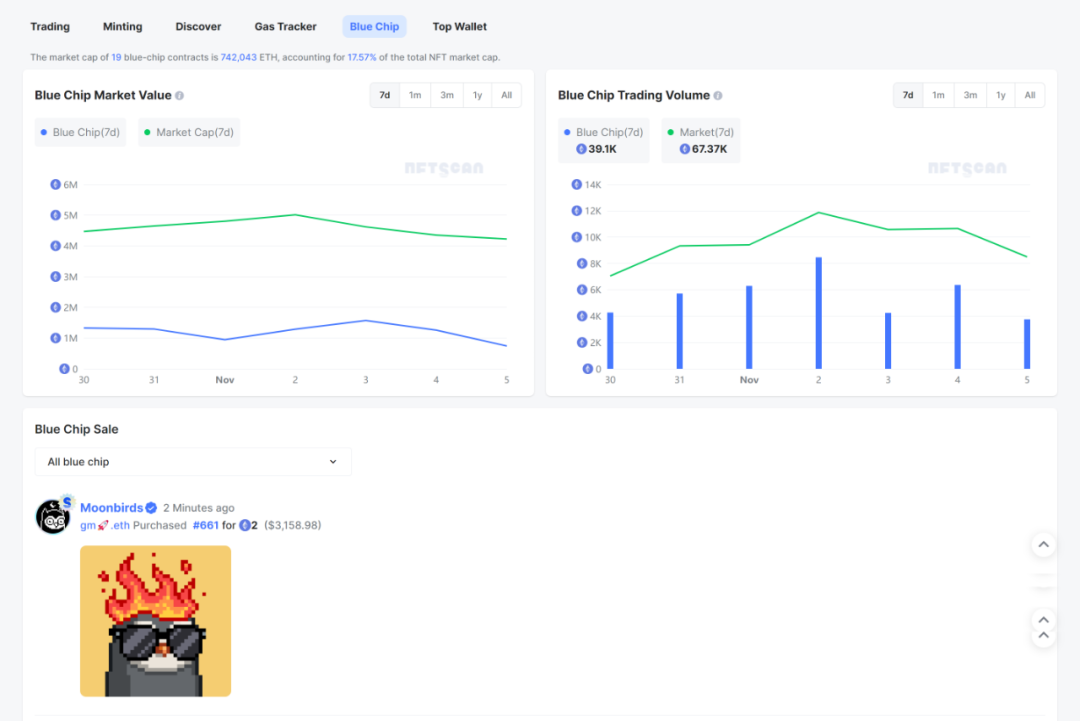 当前 19 只蓝筹合约总市值为 742,043 ETH,占 NFT 总市值的 17.57%。