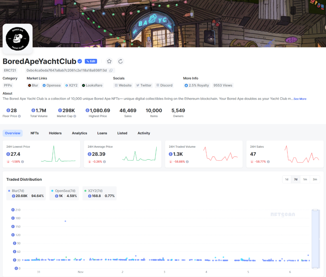 据数据显示,目前以太坊上 BAYC 的链上总交易额已超 1.7M ETH,目前地板价为 28e,过去 7 天交易分布主要为 Blur(94.64%),Opensea(4.59%),X2Y2(0.77%)。过去 7 天交易额 22.95k ETH,交易笔数 763。