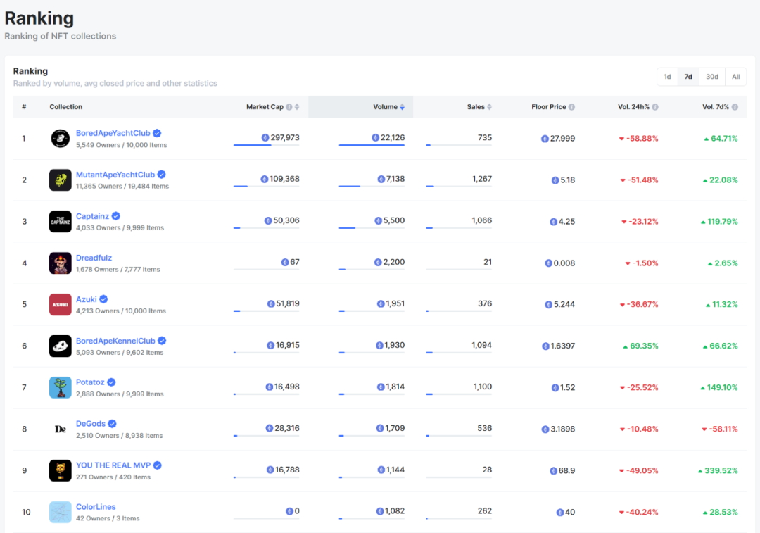 上周 BoredApeYachtClub 位列第一,目前地板价在 27.99e 有一定回暖,7d 交易额为 22,126e,7d 交易额增幅达 64.71%;MutantApeYachtClub 以 7,138e 的交易额位列第二,目前地板价为 5.18e;Captainz 上周交易额为 5,500e,地板价在 4.25e 左右,排名第三。整体市场交易额和地板价均有明显回暖。