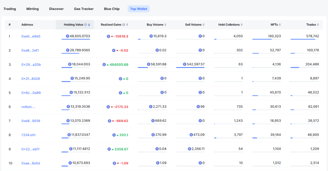NFTScan 对排名前 1000 的 NFT 持仓价值钱包地址进行了分析,当前持有价值排名前 10 如下图所示: