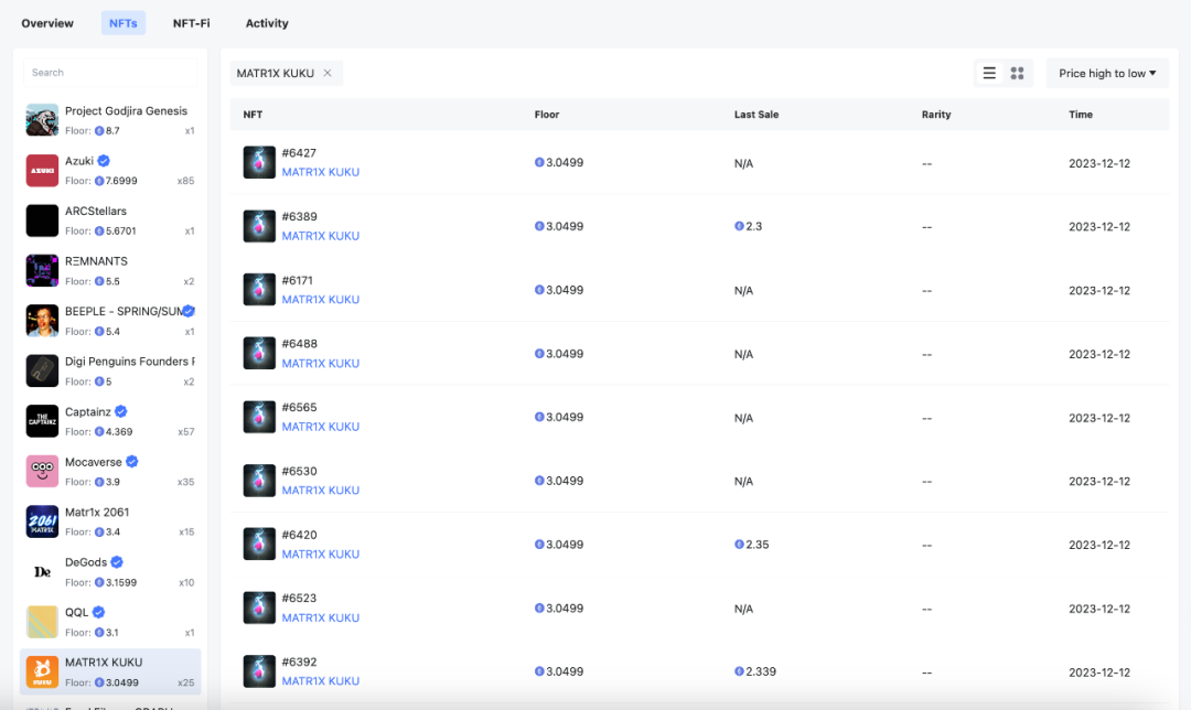 持有大量优质头部项目为组合提供了稳定的价值基础的同时,跟随市场新趋势进行适当调整也很重要。例如在 MATR1X KUKU 这个项目上,该地址已经开始购入 25 枚并且当前的地板价为 3.05eth。显示出该钱包地址对于市场新趋势和项目的敏锐关注,并且在尝试多样化投资组合。