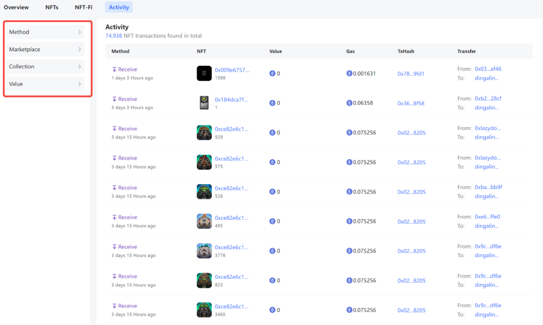 该地址下一共总共发现 74,938 笔 NFT 交易记录,在最近 1-3 天内有大量的 NFT 接收以及一些购入记录。这些接收的资产覆盖了多个项目,主要包括大量的 Animalia Tundra Titans,目前地板价在 0.14eth 左右。接收的资产价值不等,多在几百美元到上千美元不等,发送方各异没有固定的主要交易对手方。