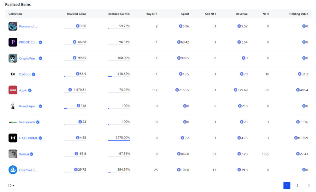 DeGods 实现了超过 400% 的正收益率及 Bored Ape Chemistry Club 全数实现了 100% 收益,具有较准的市场交易洞察力和较强的交易头寸管理能力。
