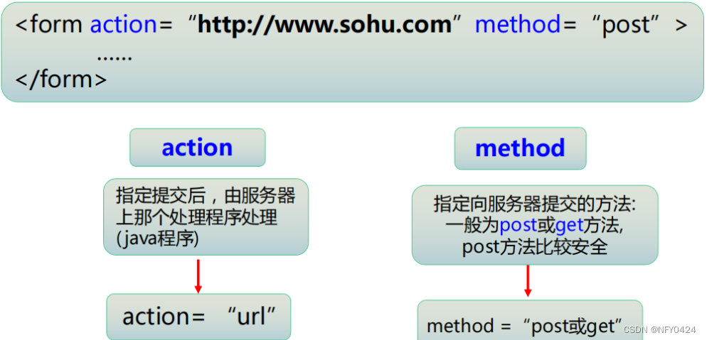 action="访问后端服务器地址" method="向服务器端提交数据的方式 http get/post"
