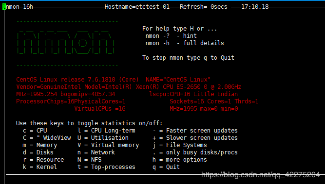 可以通过键入c/m/d/n等调出相关资源监控,如下图,分别列出了CPU,Memory及磁盘IO: