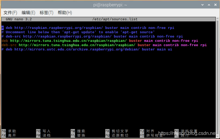 注意:这里咱们用的树莓派系统是Raspbian-buster系统,所以在写系统源链接时要注意是buster,网上很多教程都是之前stretch版本,容易出错!