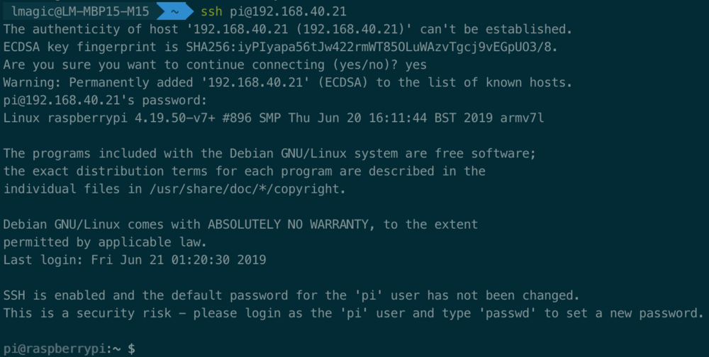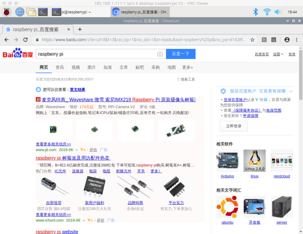 若上一步的设置正确,树莓派会自动联网。去自己路由器的管理页面找到给树莓派分配的IP(用网段扫描工具也行),保证电脑与其在同一网段,然后用SSH工具(PuTTY、XShell等)或者命令行SSH到树莓派。默认用户名为pi,密码raspberry。这是登录后用MBP截的图。