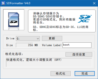 准备好Micro SD卡(≥16G,Class 10及以上就行,比如我用的闪迪高速)和读卡器,先用SDFormatter格式化Micro SD卡,界面很简单。