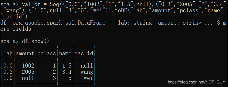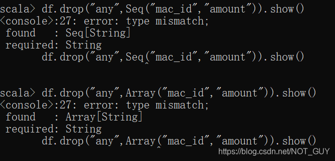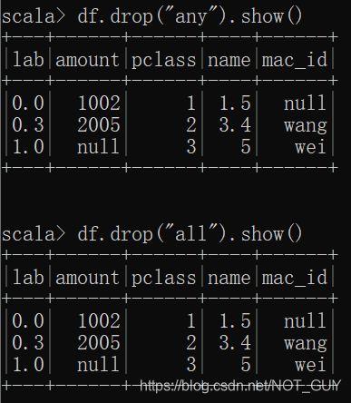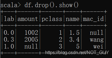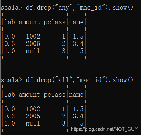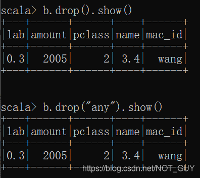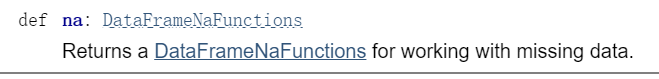 4)如果想要调用DataframeNaFunctions中drop接口,需要先利用dataframe.na得到一个DataframeNaFunctions类型变量,然后利用该变量调用DataframeNaFunctions中drop接口。