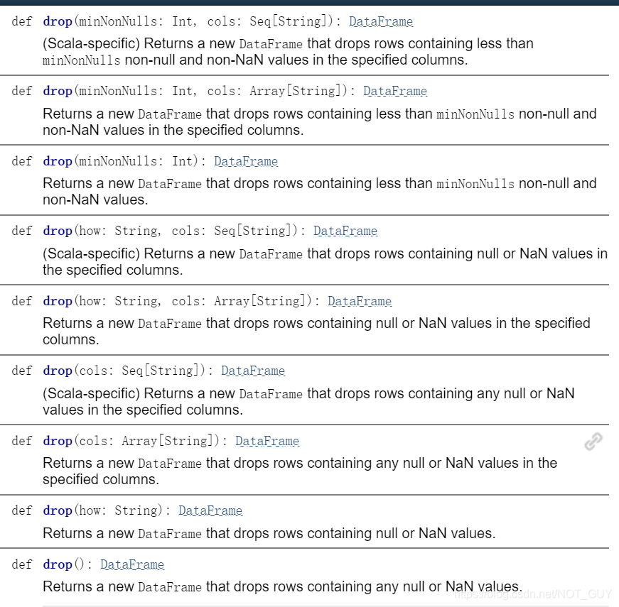 查看DataframeNaFunctions中drop的api接口描述,如下,都是返回一个丢弃含有null/NaN的行后的新dataframe,