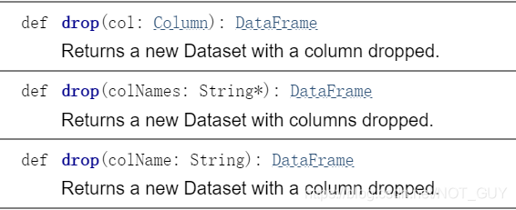 查看dataset中有关drop的api,描述如下,返回一个丢弃指定列的dataset