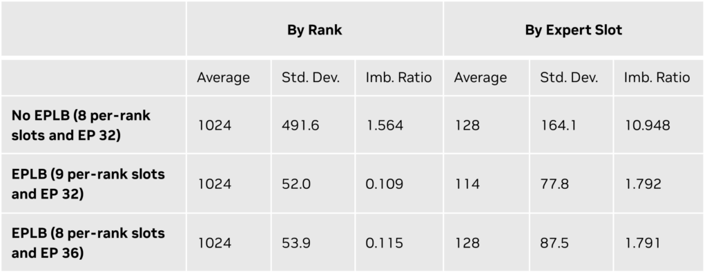 表 1 列出了上述情况下的标准差和失衡比率。每个数值均为各层各迭代指标的平均值。未启用 EPLB 时,负载失衡严重 —— 最热门 rank 接收的传送 Token 数平均比整体均值多 1.56 倍。EPLB 可有效降低负载失衡 —— 最热门 rank 接收的传送 Token 数平均仅比均值多约 0.11 倍。