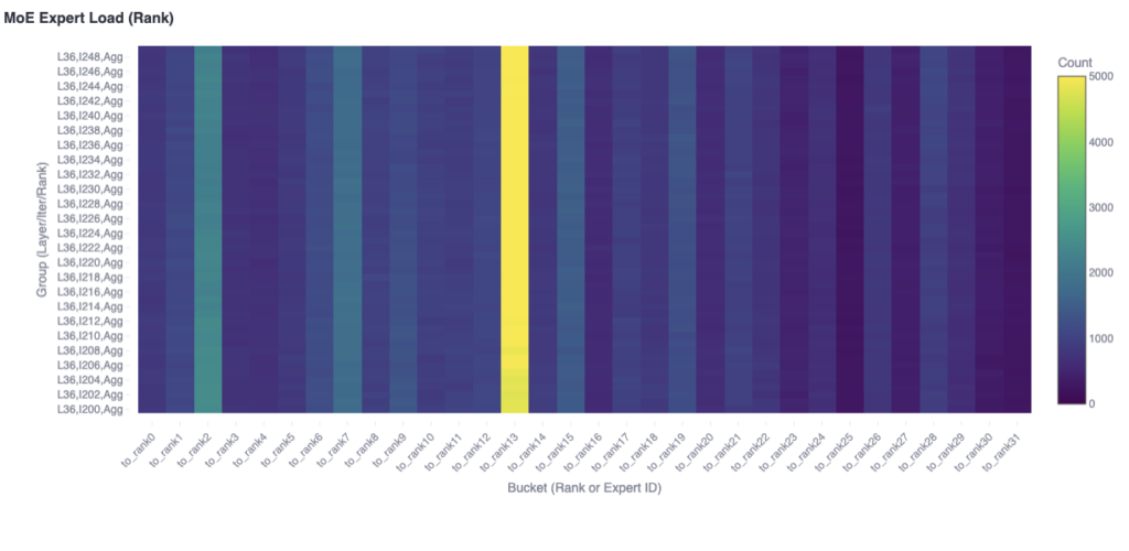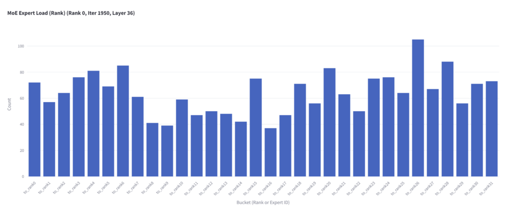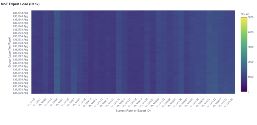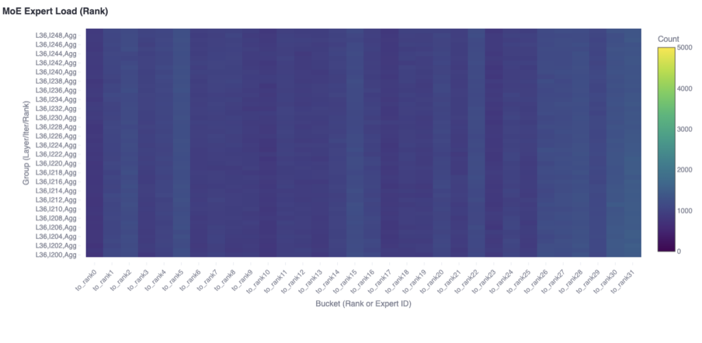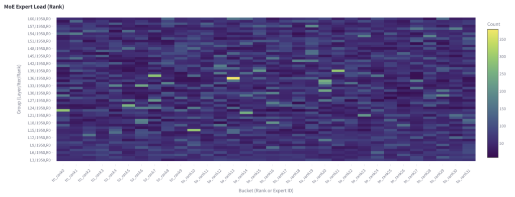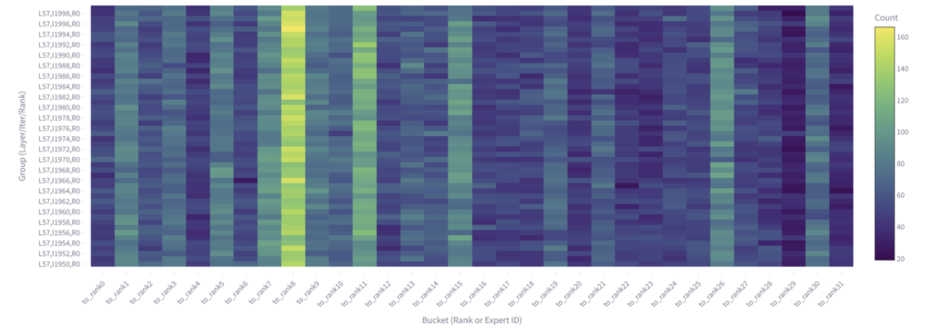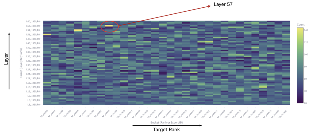 图 6. 从 rank 0 发送到所有 rank 的 Token 数(对应第 1950 个迭代步)及所有 MoE 层