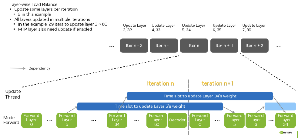 为实现权重更新的非阻塞处理并避免“停止世界 (Stop-The-World)”现象,我们采用分层更新的策略。在某一层的前向传播完成后,我们在其下一次前向传播开始前执行该层的权重平衡操作;若本次迭代中发生权重更新,则同一层的下一次前向传播需等待更新完成后再进行。
