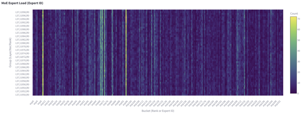图 11. 单次请求下第 57 层每个专家在 400 个解码步骤内接收的 Token 总数