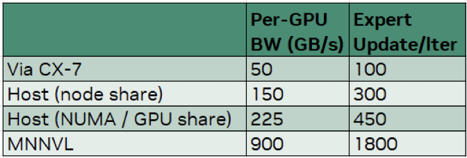 假设我们将 50ms 的跨 Token 延迟 (ITL) 作为主要延迟约束。通过粗略估算,可以计算出在每次解码迭代中,可从 MoE 权重池(可保存在 Grace CPU 显存或另一节点上的 GPU 显存中)移动到 Blackwell GPU(用于实际 MoE 推理)的专家权重数量为: