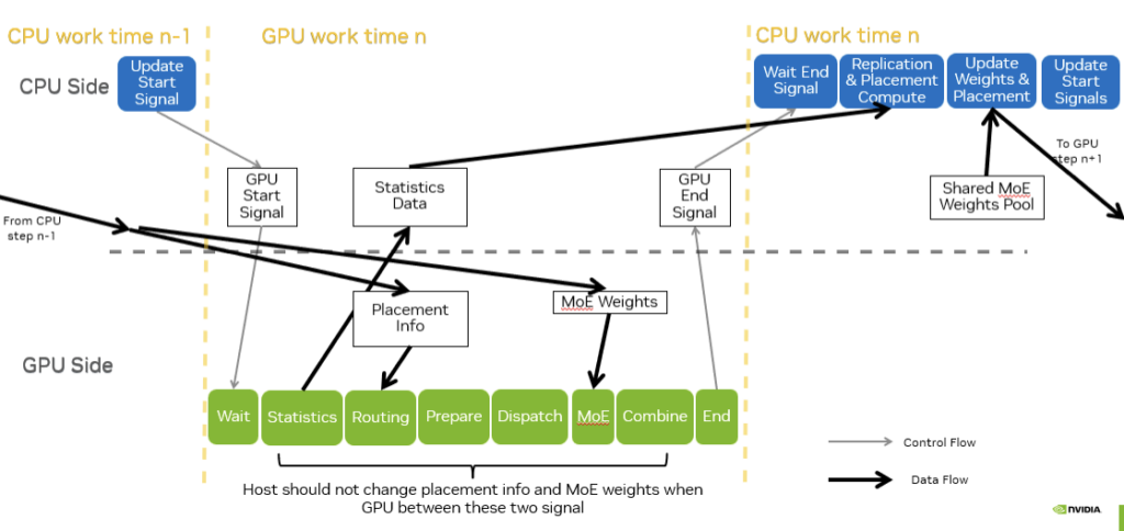 - 编排流程(更新权重与放置组件)将 MoE 权重从 CPU 内存更新并重新加载到 GPU 设备显存。该组件还将使用由复制与放置计算组件生成的放置信息。我们的可扩展设计允许通过 MNNVL 或 NIC 从远程 GPU 显存重新加载 MoE 权重。