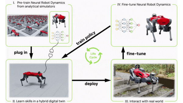 随着机器人技术的进步,我们可以试图构想这样的机器人生命周期:每个机器人都配备从解析仿真中预训练的神经动力学模型,该模型可随着机器人与现实世界的交互不断微调,从而适应机器人的磨损和环境变化。