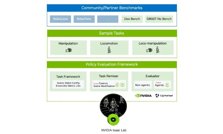 在此基础上构建的示例任务库,涵盖了操作、移动及移动操作三个类型。NVIDIA 正与策略开发者、基准测试编写者,以及光轮智能等仿真解决方案提供商开展合作,助力各方在该框架上开展评估工作,同时将评估方法反馈至社区。