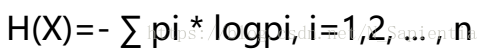 2, 在说明什么是熵,熵在本科的信息论中有定义,是信息论中非常重要的理论,熵是表示随机变量不确定性的度量,概率大的熵小,可以理解为概率与熵是成反比的,如果一个样本特性都是固定一个值,那熵就是0,因为信息很稳定,不变的。计算熵的公式如下: