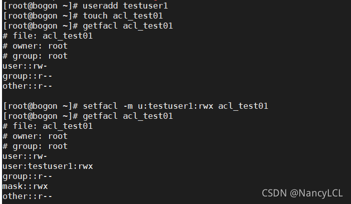 7.创建文件,查询文件的acl且为文件设置acl 用户为testuser1 权限为 rwx