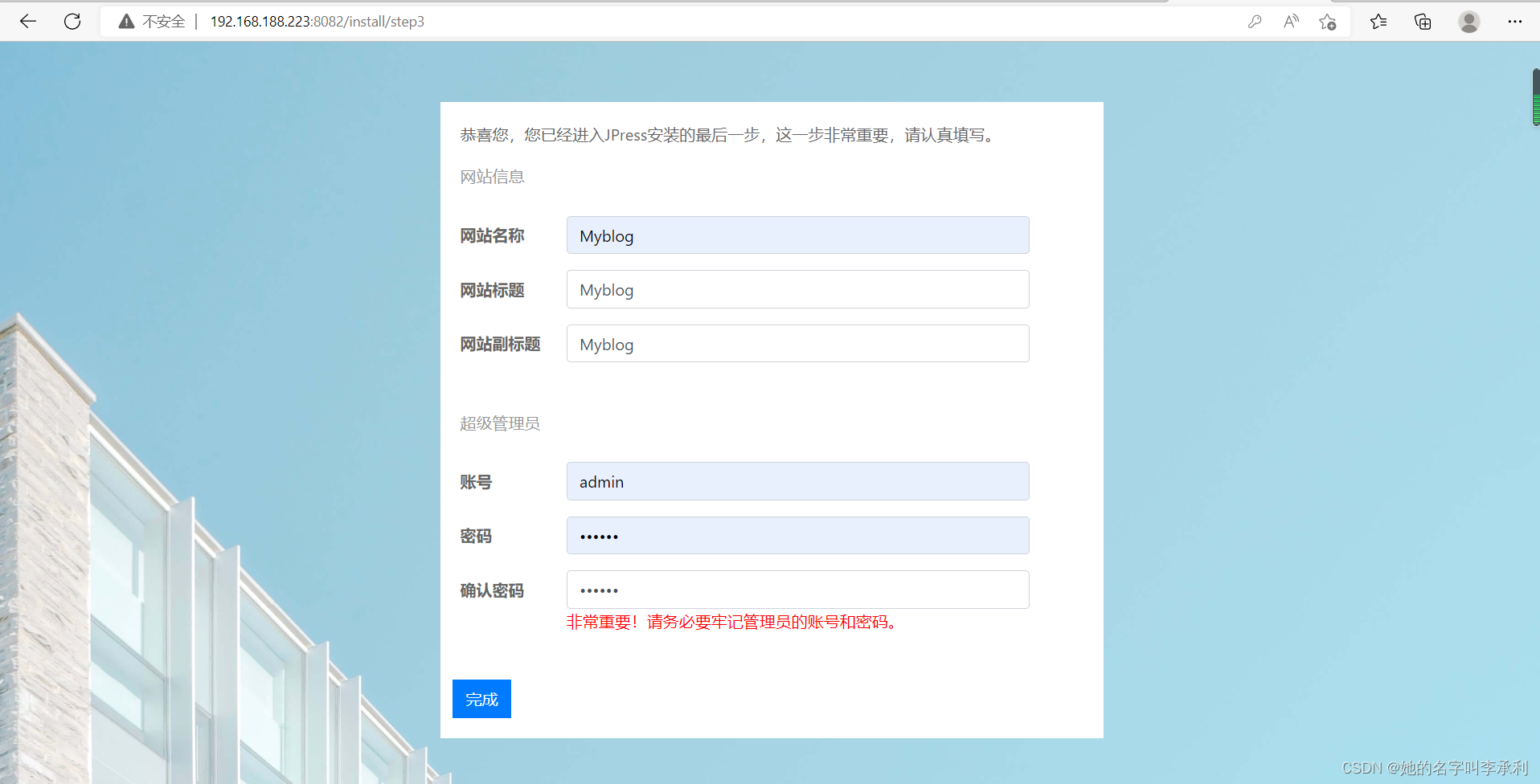 7>. 访问宿主机的8082端口,检测jpress容器并搭建jpress论坛:
