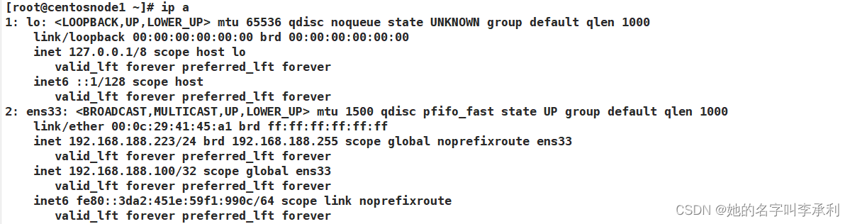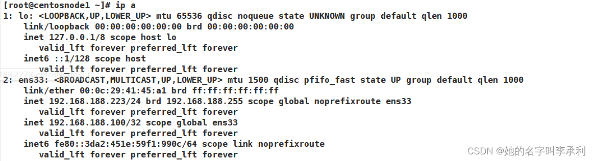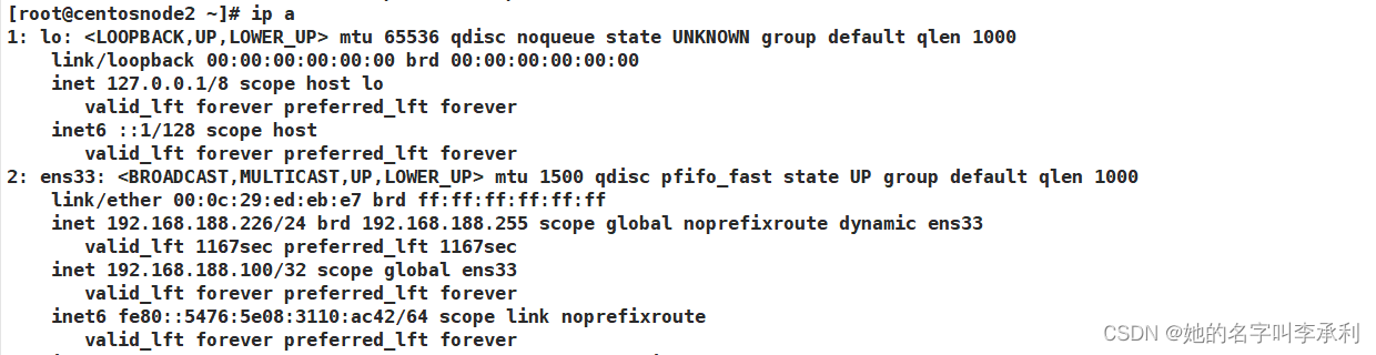 再次查看vip,发现vip飘移到了centosnode2主机上。可以将centosnode1主机的Nginx服务再次开启,会发现vip又会飘移到了centosnode1主机上,因为keepalived默认配置抢占主服务器,优先级高的服务器,将抢占到vip。