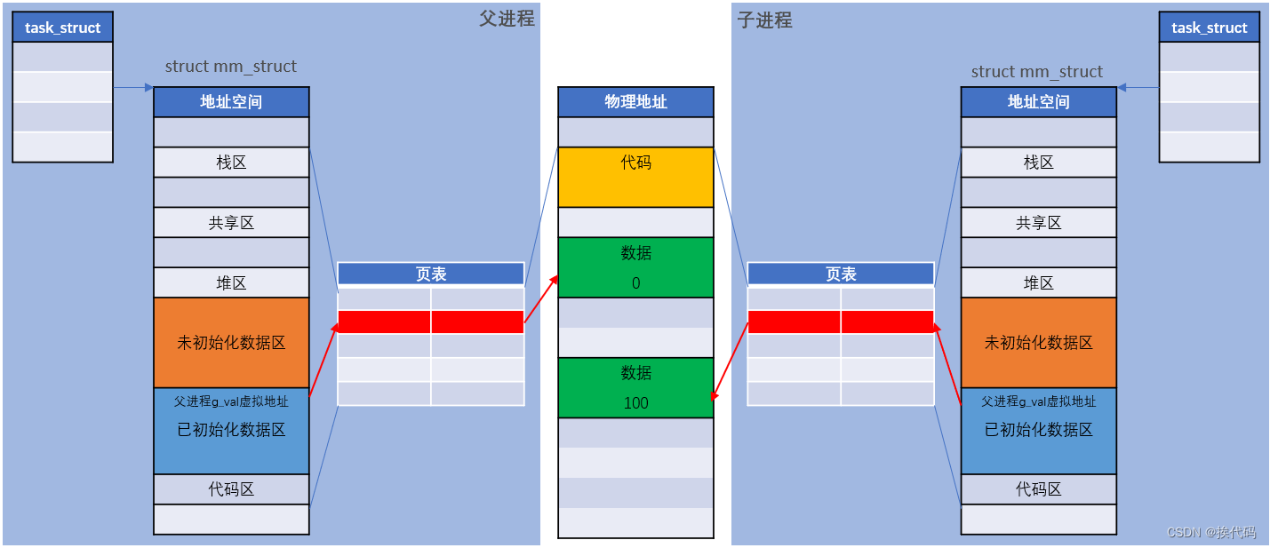 - 变量g_val值不一样,说明父子进程中此变量一定不是同一变量;