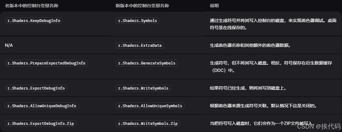 用于调试着色器的控制台变量:用于调试着色器的控制台变量有部分改动;