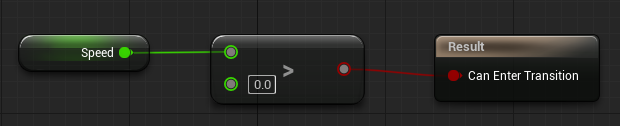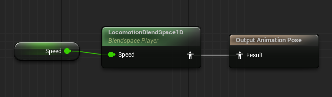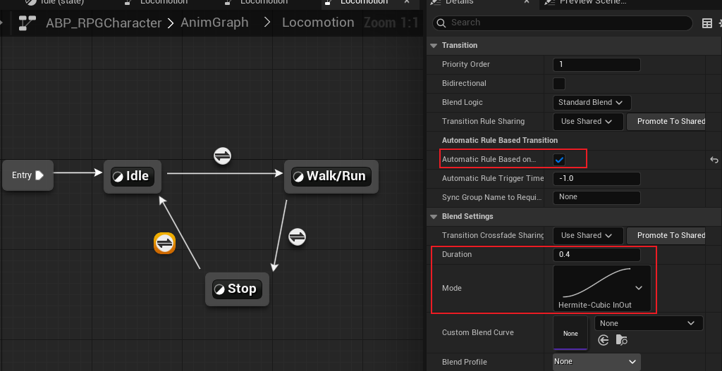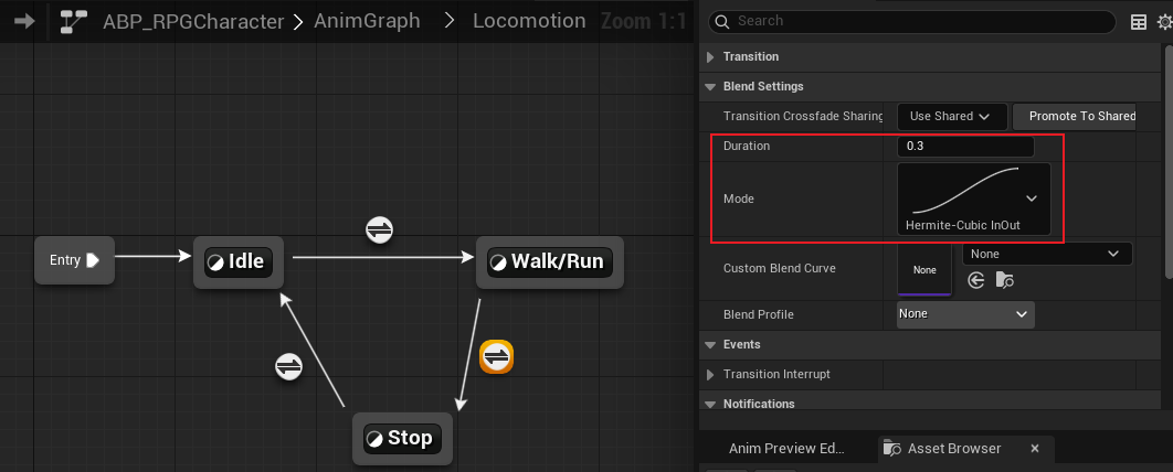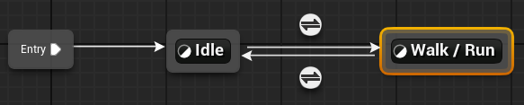 - 返回到状态机,在添加Walk/Run状态,并添加LocomotionBlendSpace1D,提升Speed为变量;并设置转换规则Transition;