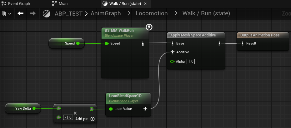 - 在Walk/Run状态内混合添加LeanBlendSpace1D,并提升设置变量;