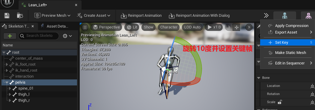 - 设置Lean_Left,选择骨盆pelvis,旋转10度并设置关键帧;同理在设置Lean_Right;
