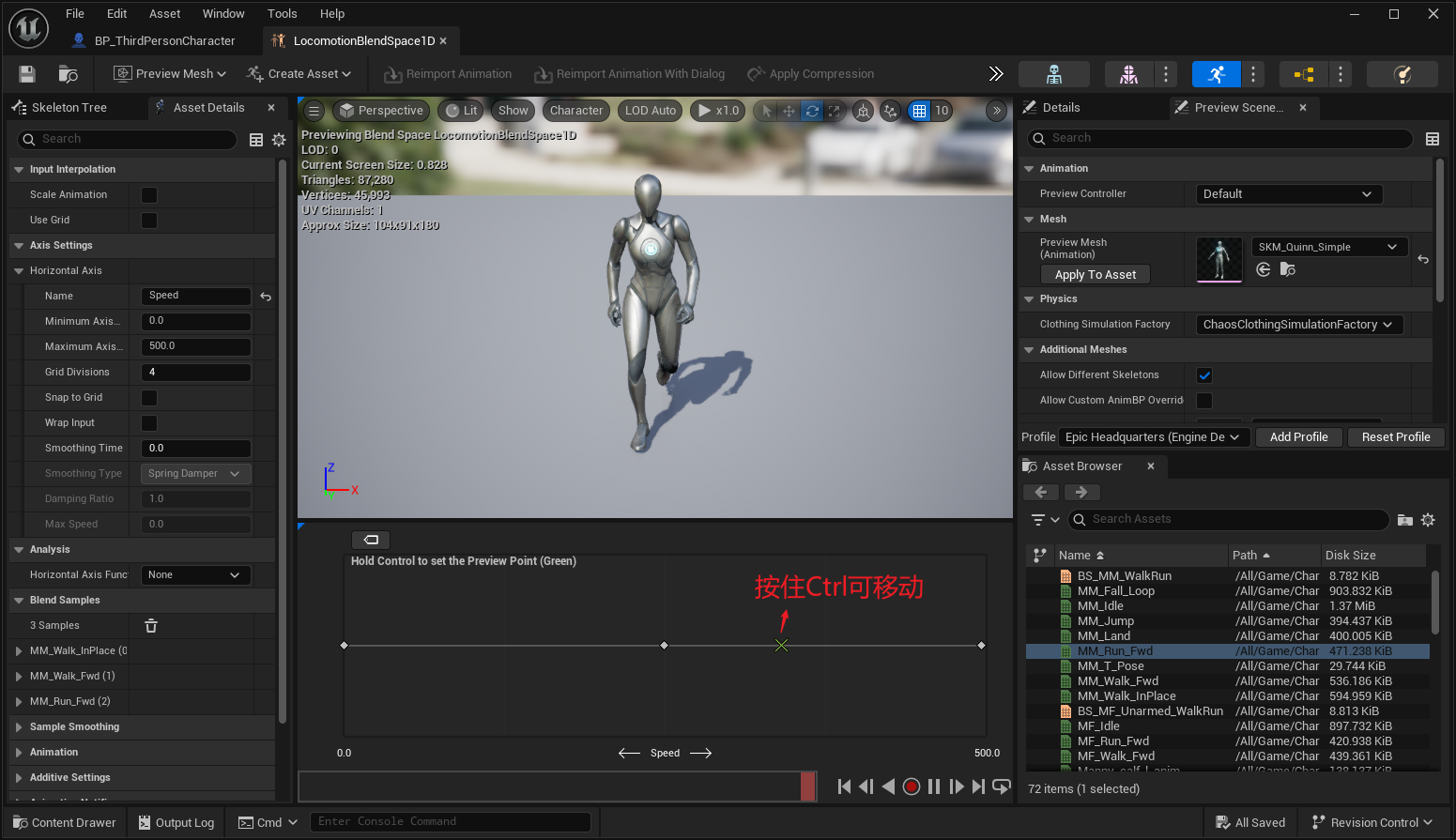 混合MM_Walk_InPlace、MM_Walk_Fwd、MM_Run_Fwd动画,表示角色从原地到奔跑这一过程角色动画的变化;