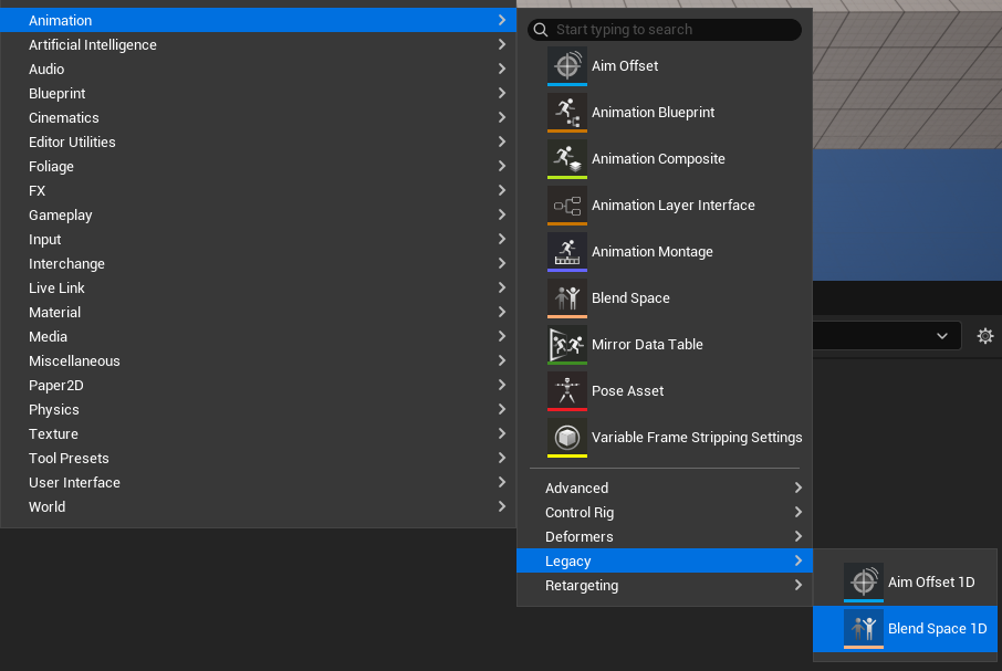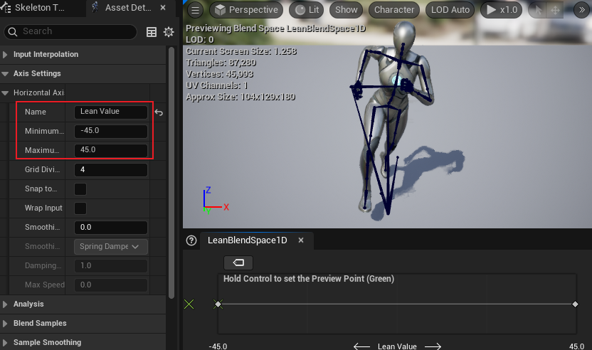 - 创建Blend Space 1D,命名为LeanBlendSpace1D,并设置Horizontal Axis参数;