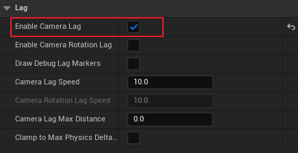 激活Lag,角色在场景移动时,其后相机有个平滑延迟;