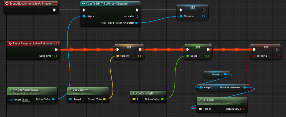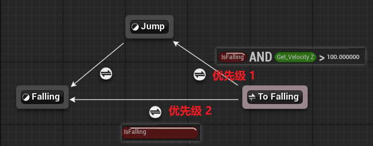 - 在事件图表内获取角色蓝图,并设置IsFalling变量;