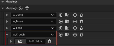 - 在内容浏览器内,创建新输入动作IA_Crouch,并设置IMC_Default;