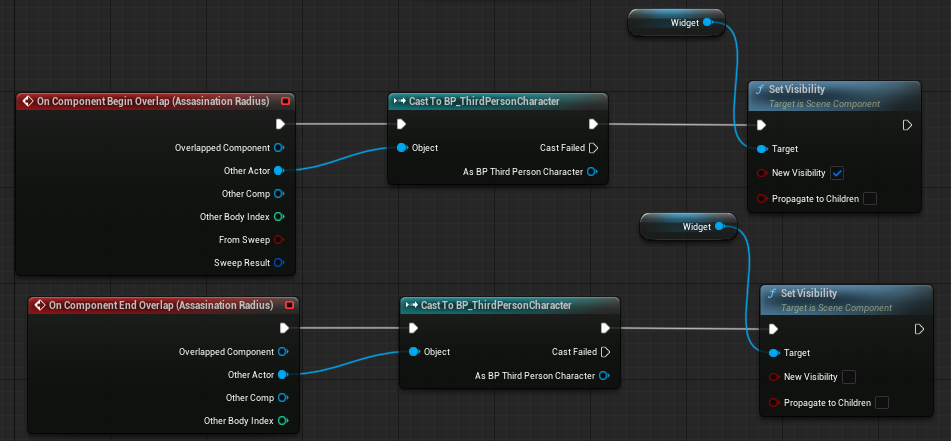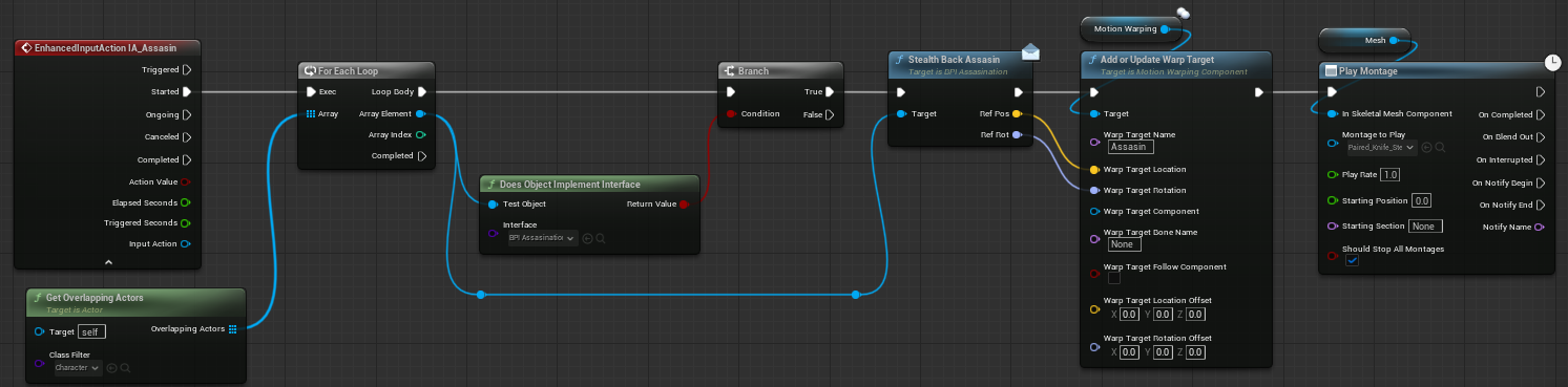 获取玩家角色的重叠对象,循环查看此对象是否添加暗杀接口函数,添加此接口的话,即调用此对象接口函数,对象即播放被暗杀的动画,玩家播放暗杀动画(玩家动画有扭曲变形);