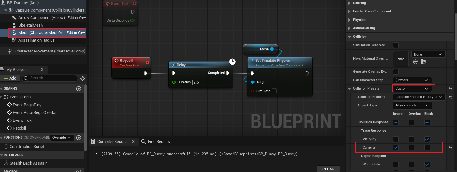 - 设置mesh角色碰撞为 physics Actor 在调整为 custom,在设置忽略相机;
