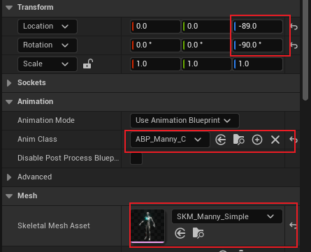 - 将角色移动并方向向前,及选择动画模式和动画类;
