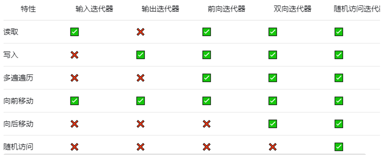 虽然指针是迭代器的一种形式,但并非所有迭代器都具有相同的指针功能;根据迭代器支持的属性,分为五个不同的类别: