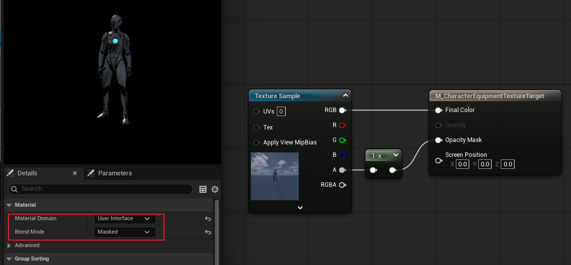 - 根据Render Target(CharacterEquipmentTextureTarget),创建材质M_CharacterEquipmentTextureTarget;