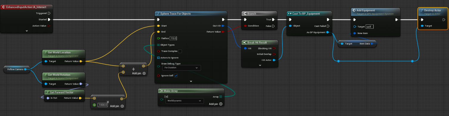 输入动作后,从follow camera球型追踪,如击中的是BP_Equipment,则拾取(添加到变量MyEquipments,并销毁BP_Equipment);