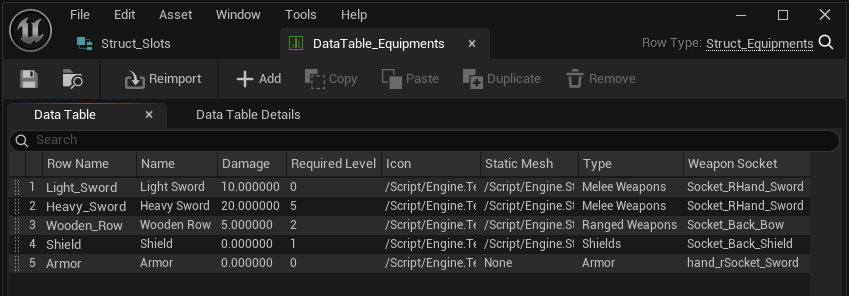 创建存储不同类型装备的数据表DataTable_Equipments;