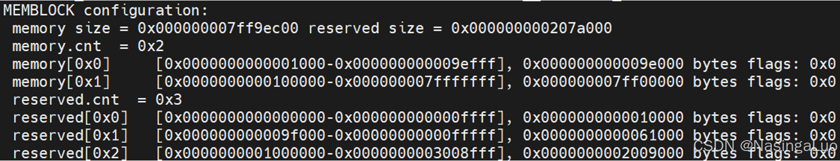 事实上,系统中的内存可能用于存放内核镜像,存放设备树等目的。这些memblock是需要保留的内存块,会添加在memblock的reserved中。总之,当我们在memblock完成初始化之后,系统会通过memblock_dump_all获得现在的memblock的分布情况