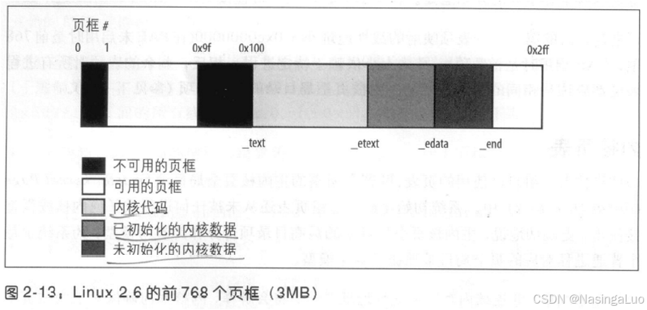 其中,0x9f到0x100页框,也就是640k~1M物理内存,是留给BIOS的著名的洞。白色的页框,就是能够进入伙伴系统的页框。