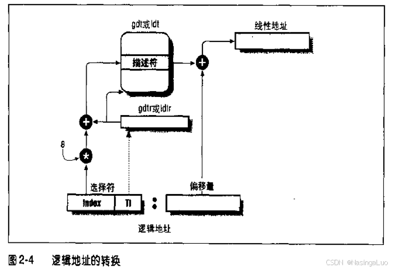 已经获得逻辑地址,段描述符,就可以获得对应的线性地址。直接让段描述符中的base和逻辑地址相加就得到了线性地址。