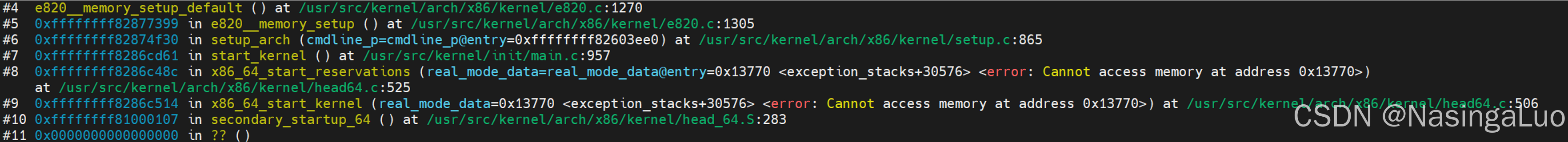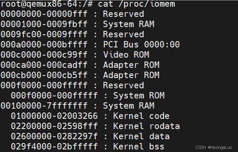 (gdb) p/x memblock.reserved $1 = {cnt = 0x3, max = 0x80, total_size = 0x1c7a000, regions = 0xfffffff82927b20, name = 0xffffffff8242f0d1} (gdb) p/x *(struct memblock_region_*)0xfffffff82927b20 $2 = {base = 0x0, size = 0x10000, flags = 0x0} //这里保留了0~64K物理地址空间,这部操作在setup_arch函数806行实现。这段物理内存不可用 (gdb) p/x *(struct memblock_region *)Oxffffffff82927b38 $3 = {base = 0x9f000, size = 0x61000, flags = 0x0} //这里保留了636K~1M物理地址空间,这部操作在reserve_bios_regions函数实现,该函数用于保留与传统PC系统BIOS相关的固件内存区域,防止内核将这些区域错误地用作可用RAM (gdb) p/x *(struct memblock_region *)0xffffffff82927b50 $4 = {base = 0x100000, size = 0x1c09000, flags=0x0} //这里保留了0~64K物理地址空间,这部操作在setup_arch函数799行实现。这部分物理地址空间用于存放内核镜像 |