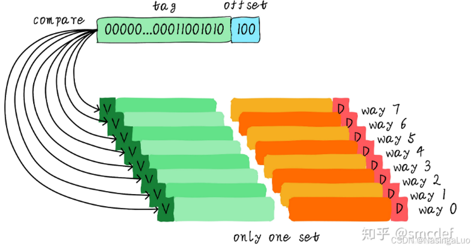 因此,这时我们只需要两位index找到两个cache line。然后比较剩下的地址和每个cache line的tag。如果比对成功并且cache line有效,那么就说明查找成功。